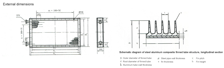 | Outside diameter D(mm) | Fin height h(mm) | Fin thickness s(mm) | Fin pitch t(mm) | Aluminum tube wall thickness h(mm) | Steel pipe wall thickness h(mm) | Total surface area Sw(m²/m) | Aluminum tube wall thickness(Sw/Sn) |
